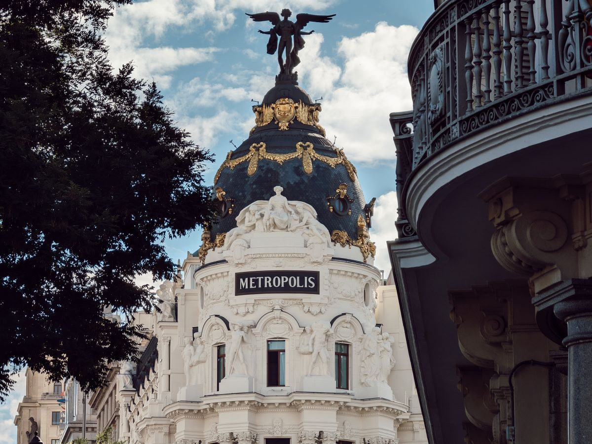 El edificio Metrópolis, uno de los más fotografiados de Madrid, destaca por su emblemática cúpula coronada por la Victoria alada, símbolo del skyline de la ciudad. Fuente: Guido Gutiérrez Ruiz.