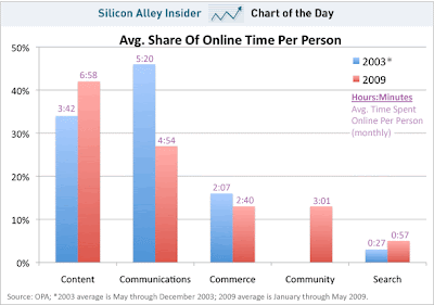 De igual forma, en 2003 el usuario empleaba un 46% de su tiempo en Internet, comunicando, y este porcentaje ha descendido al 27% en 2009.